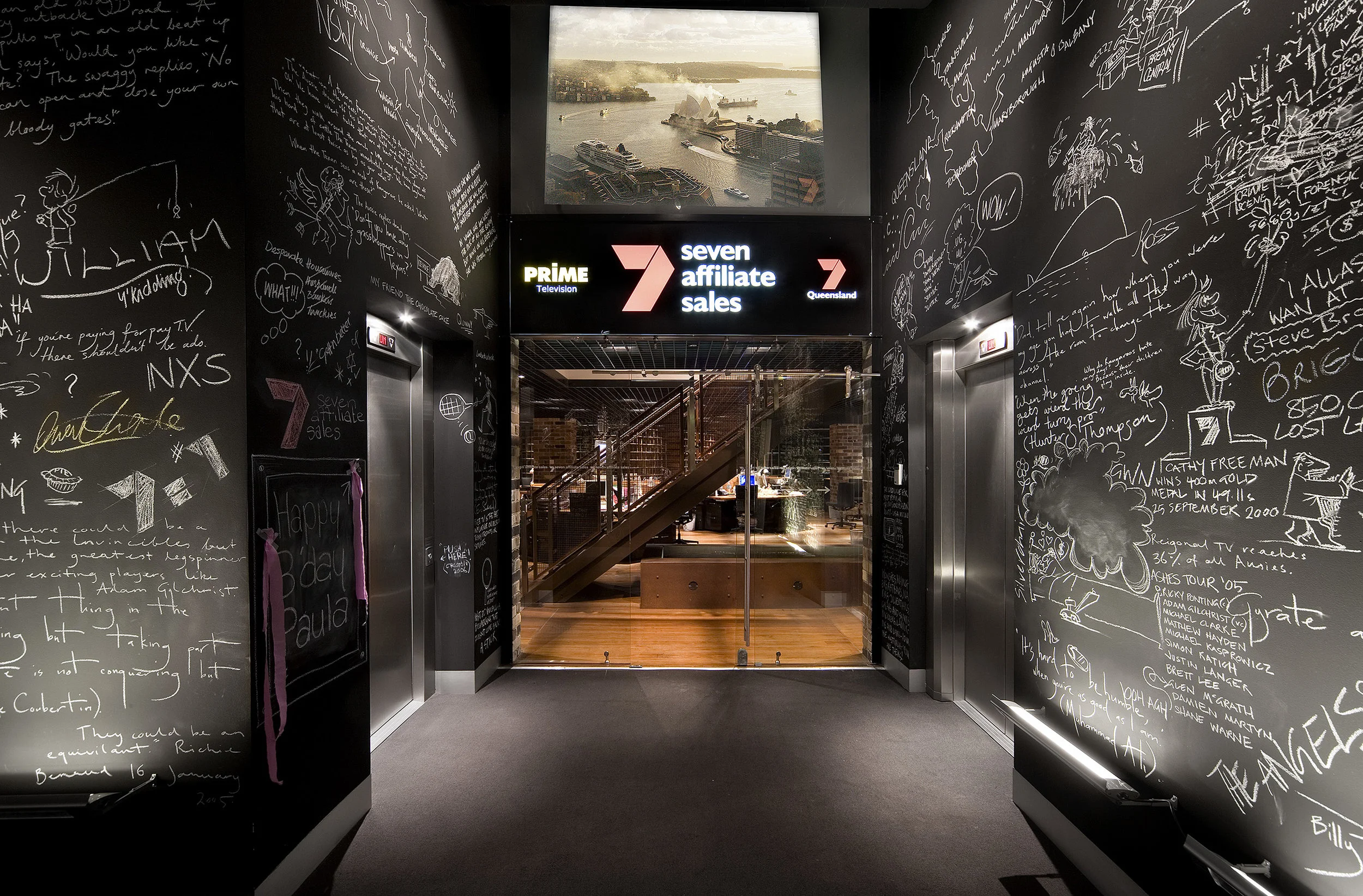 A rusted-metal clad water feature at the office’s entrance with 12 LCD screens under water display many of Network 7’s programmes.